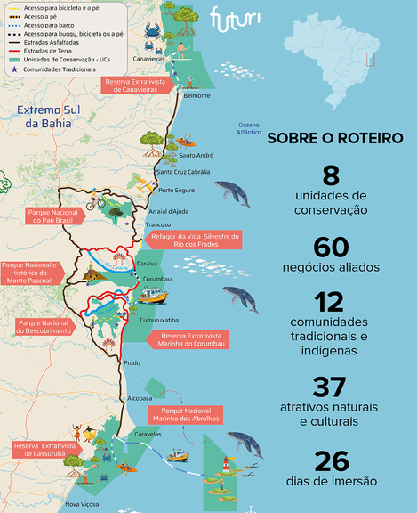 Construído de forma colaborativa, o guia percorre os municípios de Caravelas, Prado, Porto Seguro, Santa Cruz Cabrália, Belmonte e Canavieiras. "Além dos seis municípios, o roteiro percorre oito unidades de conservação federais, oferecendo a oportunidade de uma imersão em experiências autênticas, que honram uma Bahia genuína, onde a natureza, a cultura e as pessoas tecem juntas um mosaico de histórias e encantos únicos", conta Thaís Guimarães, da CI-Brasil.